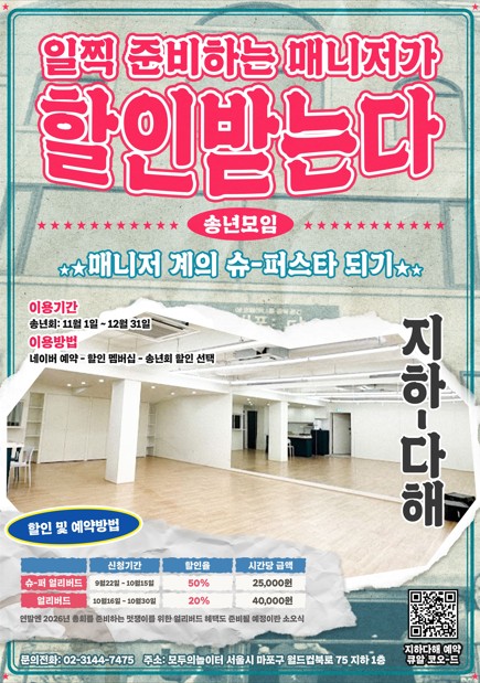 ๐ ์ฅ์: ์์ธ์ ๋งํฌ๊ตฌ ์ฑ๋ฏธ์ฐ๋ก3๋๊ธธ6(์ฑ์ฐ๋ 256-31) 4์ธต ๊ต์ค(ํด๋ฐฉ)